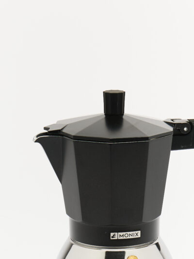Cafetera italiana clásica en color negro, diseñada para preparar un café intenso y aromático con la practicidad de un formato compacto. Su estructura combina aluminio, vidrio borosilicato y silicona para ofrecer resistencia, durabilidad y un uso seguro. Ideal para quienes buscan una preparación tradicional con un diseño moderno y funcional.